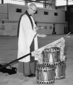1 Pastor, vermutlich Baujahr 1939, mit Schuhen, Hose und weißem Talar sowie Schürze